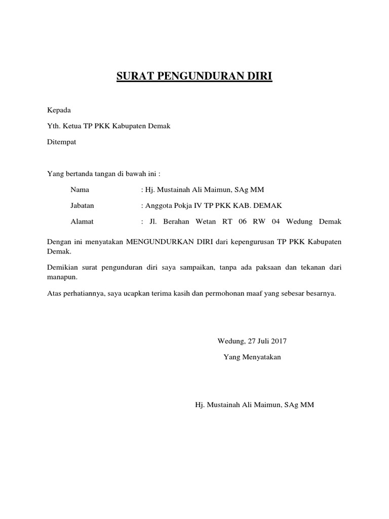 Kepala desa tajem di tempat. Bagi kalian yang ingin mengundurkan diri dari suatu pekerjaan dan membutuhkan surat izin pengunduran diri, di sini penulis akan memberikan contoh dan cara membuat surat izin pengunduran diri tersebut dengan baik dan benar. Melalui surat ini saya akan menyampaikan maksud dari pengunduran diri saya sebagai kepala humas di lsm anak muda peduli makassar karena harus melanjutkan kuliah di luar negeri terhitung mulai tanggal 30 juni 2018. Terlebih pada saat ini persaingan dalam dunia pekerjaan sangat ketat. Surat pengunduran diri dari sekertaris rt.